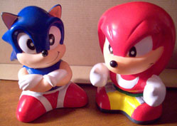 These plastic coin banks were available in 1998, and this set was found at a comic shop in the USA. The banks reduce each character down to a super-super-deformed head, arms and feet. There's only a tiny bit of the chest showing, and no legs at all. Retailing at $20.00 each, they were more than what was published on Ebay later on. The Knuckles is a bit better looking than the Sonic because the piece between his eyes is supposed to go all the way down (and Sonic is technically a cyclops, while Knuckles isn't...though here they both aren't)