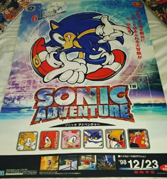 Here's a store poster for Sonic Adventure 1 (At left). It's set up in a more 'art' way than an advertising way without tons of text or screenshots & flashy headlines. It has that 'circle' Sonic, the logo & square portraits of all the characters across the bottom. There are still headlines (vertical red, smaller black) but with the somewhat abstracted background & giant Sonic art, it comes across as more 'poster like' than 'billboard like'.