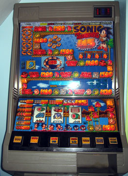 The buttons let you do things like spin, bank, collect and bet various amounts on the wheels. It plays the Green Hill Zone, and Sonic 1 & 2 opening songs, also it has the sound effects from those games. While obviously not as high-tech as current slot machines this one is still a great display of classic Sonic styled action and art.
