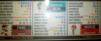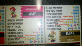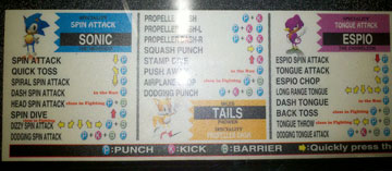 Here are the panels of instructions for the game. The top left has the basic moves, like jump & run with how you tilt the stick. The others are the character-specific moves which you can read here, along with how to do them. Espio has toungue attacks, Sonic spins, Knuckles has a variety of punches, Bean pecks & throws bombs (Terrific Peck Attack?) Fang jumps/kicks & shoots, Bark punches & throws, Tails uses his tails and Amy works with the hammer a lot. Her "What's that" is a trick move, to distract an opponent.