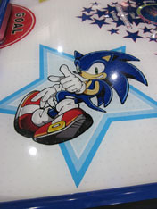 What's more exciting than a regular Air Hockey Table? Try a QUAD Hockey Table! This special, giant air hockey table has 4 goals for 4 players all at the same time. It's got great Sonic themed art all over, from the fun stars in the center to the different characters in stars for each of the corners. You can see Sonic, Tails, Knuckles & Amy. There's the Sonic & stars graphics on the sides too. You can see the 'spin' like blue shape over the logo which lets you know that the table is made by the same company who made the regular Air Hockey & arcade mini basketball (on page 3) . Want to see it in action? Use Quad Hockey Video! There's LED lights for score indicators in the middle/points, the puck-return & new players can join at any time. It also plays music, & can use 1, 2, 3 or 4 players. Hear the game with a Youtube Quad Hocky Video 2, discovered by CrystalSonicfan
