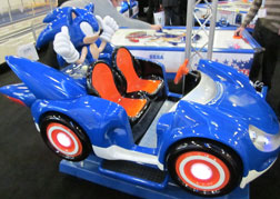 This isn't a game per se, but kiddie 'rides' like this one can sometimes be found in arcades. You put in a coin and then the ride makes noise and tilts around in some way. These aren't as popular as they used to be, so it's surprising to see a brand new one in 2012. This is Sonic's car The Speed Star from Sonic Sega All Stars Racing. It has been modified to have 2 seats instead of one, & a Sonic statue is 'riding' on the back. This thing can provide fun photo opportunities for fans...if you can find it. Do you know where one of these is? Write in for credit!