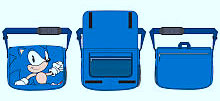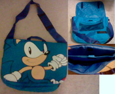 The whole thing is Sonic blue, and it features a large off-angle stock walking-Sonic for the art.The art is extra big so it bleeds off the edges, creating design interest. With the center art, you can see the extra zip pocket for the interior. Flat bags like this are great for carrying books or laptops. The Sonic design is slightly raised, and the material feels thick. This can be found at Toys R Us in 2011 / winter, and should be about $24.99 .