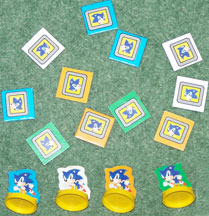 That little blue thing is a catapult that you put the Sonic player pieces onto to launch them around the board somehow. Notice that each Sonic player piece is color-coordinated with 3 of the little 'monitor picture' tiles in the photo to the left. What do you do to play this game? Write in if you know!