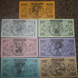 The money is also Sonic themed with a different character for each denomination. Chao is a dollar, Rouge is 5, Shadow 10, Amy 20, Knuckles 50, Tails 100 & Sonic 500. They are all CG art, not stock art.