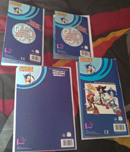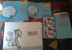 Here are some great Sonic themed birthday cards! Each one has a CG art of Sonic doing something (running, snow boarding, standing with Tails) Two are year-specific (5 & 7) and those special cards come with a plastic pin badge. (seen in upper right corner) So it's like a card with a mini gift! Inside, some have repeats of the art, or mazes. (the maze has a Sonic vs Eggman theme, while collecting rings) There are also character profiles (top right corner) You can see the maze solutions on the card-backs. The one with two pictures is a "spot the differences". The messages are "Have a Super Sonic Birthday, or a variant of "Super # birthday SuperStar" These cards began appearing in 2011/fall. You should be able to find them in ASDA stores.