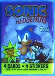 Topps Sonic the Hedgehog trading cards. This was the first series of cards released in the 1990s. (There was not another American series until the Sonic X cards) These were sometimes base-ball card like, and some had stickers which you could peel off. Mostly, they just took screen shots from the Sonic games (Sonic 1, Sonic 2 = all they had access to at the time) and added in various stock art. This caused a rather lame effect, as you can see the stock art was not much good. What is that horrible monster behind Sonic on the card pack?