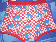Finally, Sonic underware re-appears! And this time, you can likely wear it. (Unlike the only previous pair which was kiddie-size only) This underware is for males and looks like a combo of regular underwear and a boxer short. With elastic legs and waistband it has the clinging power of a regular underwear. They went with an all-classic look here, using red checkers and various classic stock arts all over for quite a busy design. The classic logo is a tag on the waist band. You can see the paper tag with ASOS on it in the photo. You can buy these in Fall 2009 at the ASOS Online Store. They should be about 7Pound (really? 14+ dollars for 1 pair of underwear?) But does this store ship outside of England where it is located?
