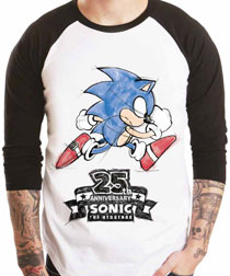 Here are 2 tees with a fun sketchy style to bring new life to classic stock art Sonics. The left has 'getting ready to run' Sonic in a 'pencil sketch' form with black & white color only over the 25th Anniversary banner. The right tee is a long sleeve with white body & black sleeves. It has 'running profile' classic Sonic also in sketch style (guides left in, line ends on, etc) but he's colored 'color pencil style'. He's a bit above the 25th Anniversary banner, which is in black/white sketchy look print. The drawing style & 25th logo make these tees stand out in a crowd.