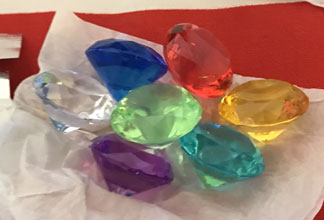 It's all 7 of the Drop Dead Chaos Emeralds bonus items. It is very hard to get them all because they are both blind-packed (in those foil things you see there to the right) AND randomized - enclosed with whatever merchandise you ordered. No one had control over what you were going to get since it is mail offer items. Also, the items (as you can see from reading here) weren't inexpensive, which meant lots of buying & collecting (maybe people could trade too...if you knew someone else in the area) had to be done to aquire all 7 colors. However, here you can see it accomplished! And, they look great. The facets are pretty, the colors are accurate, they're a nice size...they're exactly what is cool as a bonus.