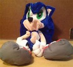 Totally-flat Tails above is also a Toy Network plush, as is this Sonic here. This rather large plush has been unstuffed, likely in order to save money in shipping it somewhere. Unlike the Tails though (this one is probably bigger) it has some 'chambers' sewn in, where parts are 'sectioned off' from others. The hands & shoes seem to be the case here. They seem to have picked the filling out of the head, body & arms mostly, though he's not flat like the complete job. Of course, this doll didn't start out looking too super, and losing its poly-fill has only made it worse.