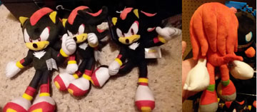 As you can see...the Chao is somehow huge. The head is gigantic compared to the dolls. Yes...it had different proportions (its a lil' thing in the games) but it turned out surprisingly big, something that can only be seen when everything's together like this. Then, you can notice some differences in the Shadow plushes, one's a much darker black & the face seems in better order. This is kind of annoying and signals a quality control issue on different 'versions' (buying online? Can't tell what' you'll get & etc) The Knuckles has ok spikes but some curl out a bit, and the tail isn't stuffed very well, as seen at right. This does show that he got good, big fists for this pattern, which is nice.