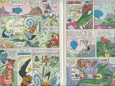 Manak and Mawhinny were the main interior pencillers, and their sloppy, scratchy style was generally unappealing. The comics were also streight-foreward, with no real intellectual plot points or mystery to keep anyone engaged. His 'backup' also consisted entirely of new and un-appealing characters. It didn't help his cause that Tails was portrayed as a somewhat-bratty babyish character who had a huge ego, and would regularly fantasize himself as an ugly super-hero-type. Also: TAILS IS NOT BROWN. My scans aren't bad, it is just that Archie is still insisting that Tails is not orange/yellowish.