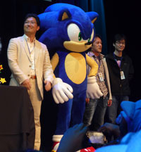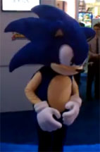 This is the mascot suit Sonic that Sega chose for the E3 2011 event. Here you can see it near their booth, near Sega people, and near the special Green Hill Zone themed 20th Anniversary cake. The cake is fun, complete with classic checkering and loop. Stars and palms make nice decorations, and the waterfall is a good touch. But why does the Sonic figure on the cake look so strange? It seems a bit off-model. With Generations announcements and the 20th Anniversary, this 2011 E3 was a great event.