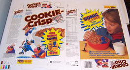 Here's the special promo box the above toys would have been included in. The starburst says "Sonic the hedgehog figure included inside" and there's a picture of how it is used (balancing on bowl edge) as well as a shot of both the blue and gold ones. Cookie Crook & Cookie Cop appear un-changed however the writing at the bottom may tell you how to use it.