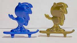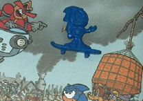 What is this mysterious little item? It isn't super attractive, or even super expensive. It was once thought to be the first physical Sonic the Hedgehog item ever released that wasn't a video game. (but it was proven later on to have been released in 1993) This simple and primitive plastic object came from a Cereal box at the time of the release of the SatAm cartoon series. As you can see, the sculpt is ok, and it shows him on a Skateboard for some reason, although he's never ridden one. This came from a "Limited Edition" version of Cookie Crisp. You could find either a blue one or a gold one inside! Fact by: Juan Martinez