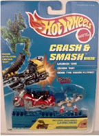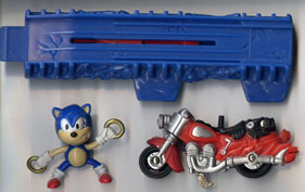 A Sonic the Hedgehog Crash-N-Smash motorcycle toy. The Sonic is not the greatest likeness, but it was done in 1995, as you can read. The right photo makes it look huge...But it is actually tiny. When it crashes, the Sonic flies off and gets lost under the sofa. You should also use caution when launching it, as it is propelled quite quickly, and backward right at you and Sonic is also sharp. A dangerous toy? Possibly...