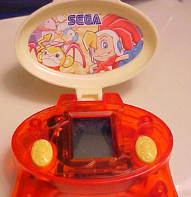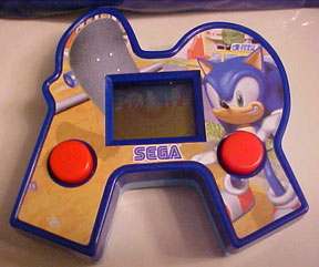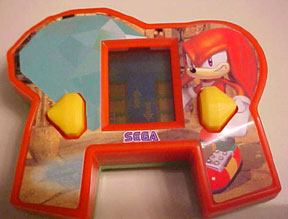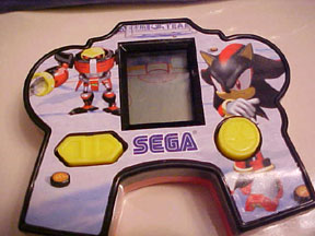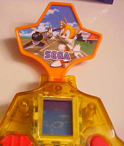 This neat little game has see-through plastic, and a lid with Tails' 'tail' symbol pressed into it. The interior has a sticker of him with the Tornado. You can use the buttons to shoot and go side to side. The enemies go faster as you level along.