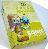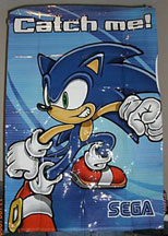 Here is some promotional material. There is a Sonic McDonalds' window cling that says "Catch Me". It's made of a sticky sort of plastic and is made to be pressed onto the window of the fast food restaurant. This one is quite large, measuring 127 by 42. After the promotions, sometimes fans can obtain these interesting items. (Much like cardboard standees, when the game promo is over) The 'catch me!' at the top is to advertise you can catch Sonic toys in the happy meals.