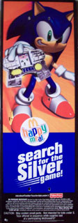 The poster announces the special promo "Search for the Silver Game" (which can be seen above) The fine print at the bottom is likely the rules/details for finding the game. This poster appeared to promote the Sonic Meal toys in 2004. It measures 12x33 inches, and was made for display outside.