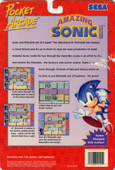 The "Amazing Sonic" Pocket Arcade LCD game. This has a 'pop-up' lid to cover the game screen so you could take it with you safely. (there was another Pocket Arcade Sonic with 'flip up lid') You can see the graphics on the back. This card says "Sonic & Robotnick are at it again. The Diabolical Dr. Robotnick has created a robot factory and it's up to Sonic to stop the metal mutants. Sonic works his way through maze-like rooms in an attempt to remove the Chaos Emeralds, the factory's only power source. Team up with Sonic through 12 levels of fast and furious action as he tries to put Dr. Robotnick out of business for good!"