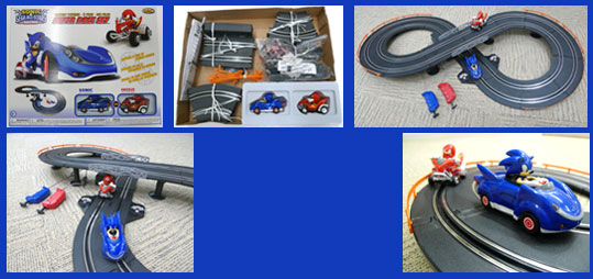 And this...is what it looks like when you open it. You can see the controllers, which have triggers on the tops to control the speed. The interior of the box has the pieces grouped together, & the racers packed securely. This race set is at SonicTeam HQ.