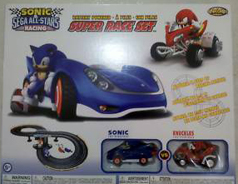 This is another generic 'remote racer' set, but it's been re-themed to be Sonic & Sega All stars Racing. As you can see amongst all the electronics pages, these figure-eight tracks are a common occurance. They're easy enough to resample, to create repeated releases of the same mechanical item. This time, the cars are little replicas of the vehicles from the game for Sonic & Knuckles. They're obviously not quite in proportion with the figures 'driving' them, & Knuckles' off-road style vehicle has been altered some, to fit the track format as well. They run along the slots in the track, & are controlled via hand-held remotes. The box back says "2 controllers, 2 race cars, 16 track pieces". It then repeats it in Spanish & French. If you don't have a slot racer set, this could be a cool one to collect, as it seems well detailed.