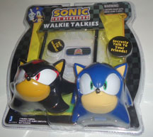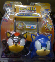 For some reason, mobile phones have not made walkie talkies obsolete enough, so this pair was produced in the fall of 2010. The units are shaped like the semi-3D heads of Sonic & Shadow. Due to the shortened spikes Sonic appears 'classicly styled' even though he's not supposed to be, and Shadow does as well, even though he was never classic! The effect is interesting, and the heads seem well made. Each has an antenna, and 'talk' button (see it there, by the right ear) There are likely mic. & speaker holes on the backs of their heads. These will need batteries (likely AA) to run, and were licensed out by Jazwares. The middle sticker says "Only at Toys R Us" so these are an exclusive, and the other sticker says "Secretly Chat with Your Friends". How much do these generally sell for? MIP photo by Taaron, plain photo discovered by KnucklesToast.