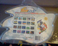 This one goes so far as to put odd little ear bumps. But those spikes can't be great to grip while you play? The theme of making a controller look like an abstract face is an odd one. It carries through to the die-cut sealed plastic container for the game. It runs on 3 AAA batteries. This will play: Sonic Blast, Sonic Chaos, Sonic Drift 2, Sonic Spinball, Sonic Triple Trouble, Alex Kidd High Tech World, Alex Kidd The Lost Stars, Altered Beast, Astro Warrior, Bomber Raid, Dr. Robotnik’s Mean Bean Machine, Ecco The Tides of Time, Fantasy Zone, Golden Axe, Penguin Land, Psycho Fox, Quartet, Ristar, and Super Columns. Info by Kirby Crew Productions