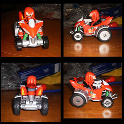 Here is the Erector Set Knuckles Landbreaker All Stars vehicle when it is all assembled. If you're going to get a version of this All-Stars Racing car, this is a decent one to pick up, if you don't mind putting it together from the kit. The detail is good, (seems above other cars) with tire textures, green shock absorbers in the front, & a well proportioned figure who actually fits on it & really looks like he's riding. This came with a red chaos emerald, which you can see sitting in the big 'screw' on the back of the car. You can also see a Landbreaker Video of this item now.