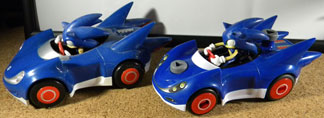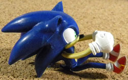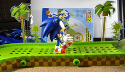 The Jazwares 3.5 line figure (left) wasn't as "designed" to fit in his vehicle. With each set you're forced to get a vehicle, so you'll end up with several Speed Stars if you want them all. Some are motorized while others are "pull back n' go". At left is the nendoroid Sonic walking on the track, to give you an idea of the size & detail. You can see how it comes with the iconic palm trees & sun flowers. The 'goal ring' is cardboard though, so watch out!