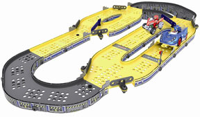 In the gallary you can see the Chemical Plant themed race set all put together. You can see it has switching areas with flipper wands to guide the cars, plus a sort of 'finish line'. At right is the "exploded view" (just means everything is hovering apart) Exploded View Car Renders