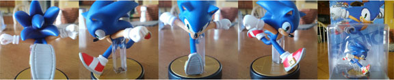 These are in-home (not stock) shots of the actual Sonic Amiibo, released in winter 2015. As you can see here, it looks just like the stock shot, with good paint, nice textured detail (see shoe bottom) and great sculpting. Even if you don't have the game, or want to use this as an electronics item, it's still good to collect because it is basically a little display figure on a base that looks nice. Keep in mind that RETAIL value should be about $14.00 for this, but "Amiibo Fever" due to early popularity has contributed to scalping, reselling, sell-outs, and fakery. Keep in mind spending, availability & bootleg avoidance if you choose to go after this figure.