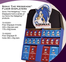 Here's something interesting, 2 different kinds of Sonic Adventure 1 chocolates. One is a bar with peanut, peanut butter, and caramel, coated in chocolate. The other is a peanut butter cup (complete with edge-ridges) which must be like a Reesy Cup. The last is the store display you never saw them dispensed from! Canadian Sonic Adventure 1 Chocolates