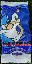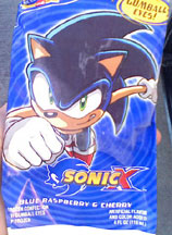 Naturally, you can't buy one, as it would be impossible to ship a frozen good. This also renders them nearly impossible to collect. These were made by Blue Bunny Ice Cream. It says "With Bubble Gum Eyes" but that is hard to read. It also says that it is "Blue Raspberry & Cherry".They have Sonic attempting karate or whatever "x-treeeem" thing he's doing on the wrapper. There is a variant wrapper with him on a snowboard in the same style.