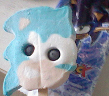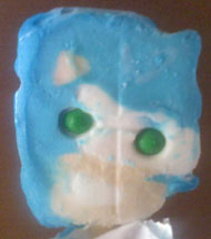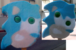 Not quite like the above picture, is it? Actually, it is a bit scary! The eyes are not on the white, the spikes are completely missing, his nose is smoohed and the color is 'bleeding' onto the wrong areas. I guess it must be hard to create good likenesses in ice cream...so what prompted them to try Sonic? He's a bit difficult just by nature. Still, perhaps the quality varies depending on melting etc...?