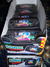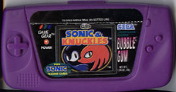 Game Gear gums! Yes, they were sort of an ad for game gears, but they all had something Sonic on the 'screen'. These are moulded plastic boxes, with flip up lids (see the dotted line?) The first ones were just black, (Like the real system) but later they branched out and did a whole variety of colors, such as purple, aqua, greenish and pink. As you can see, they updated the graphic to Sonic & Knuckles as well.