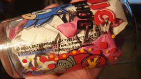The backs of the glasses have Robotnick/cartoon/AoStH, who, as you remember SegaWorld Sydney has as its favorite / they never acknowledge the games nor the 'eggman' name or look, ever. The first glass has the unusual/seldom-used art of him 'stalking' or 'sneaking' with hands above his head. The 2nd glass is fist shaking Knuckles, the third has 'surprised-hop' Tails, the fourth has....Japanese Sonic carrying Amy Rose (from Sonic CD) & the 5th has 'angry Robotnik'.