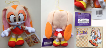 In the gallary you can see the actual fan photos of the above right Cream small plush. As you can see, you can tell this one apart by the open mouth expression. Her mouth & eyes are decals (so do be careful with this one) The doll also has the ears pinned down by a stitch at the midpoint. The tag says how she flies with her ears, & is always with Cheese. There's a loop for hanging on top of her head. The stitching on the back of her head can have issues (seen here) but GE dolls are more of a 'medium quality plush' rather than 'excellent' or 'poor'. The fabric isn't fuzzy or soft, & some of the plushes are sort of 'hard' type stuffing. This may be found at ShonenSwag.com , but where else? Info by TagTab.