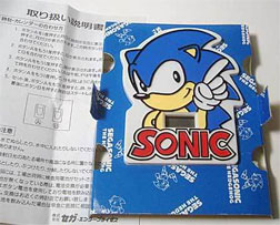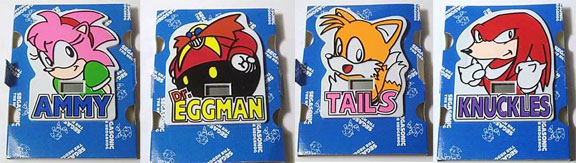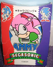 What are these curious items? Digital clocks! Though, the 'clock' part is very small, it is only in that tiny window in the center...so they resemble light-switch plate covers. Here you can see the interestingly shaped box they came in, as well as that "Amy Rose's" clock has her name spelled wrong! Yes, they apparently DID slip up on official goods: "Ammy" is written on her clock. These were supposedly obtainable from UFO catcher machines.