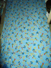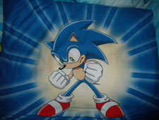This is a really cool Sonic X themed bed set. It looks like a single, with 1 pillowcase. The case has Chargin' Sonic on the front, with the Sonic X logo on the back. The other part seems to be either a sheet, or a thin blanket of some kind, with part of the cast on the front, and a scattering of Sonic X art and logos for the back. This set is a single-bed type.