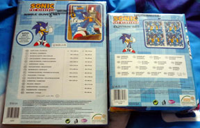 A company called Character World has gotten the Sonic license to make some cool room decor! Here you can see a "Sonic Duvet Set" (it's a sheets/blanket set) and Curtain Set. Both packages feature pictures of what they look like set up, so you can see 2 curtains & the pattern (a tad busy for curtains, but it is all right) The blanket is reverse-able, as you see here...so you can pick your cool Sonic pattern for a change of pace! One side has running/twist modern Sonic art, squares & "S" letters from the logo.