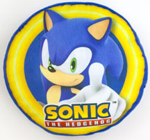 At right is the round Sonic cushion / accent pillow. If you inspect the texture, it seems to be fleecy too, so it'll wear well/not get scratched up like a t shirt design. It has CG Sonic pointing and is shaped like a gold ring.