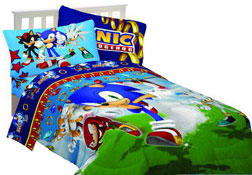 Here is 1 whole bed set from Walmart in 2012. The right side looks photoshopped in/ the whole thing just kind of doesn't look like it's really there/on that model fake bed, however that's just bad editing, the photo is real. The blanket is reversable, (with a busier Sonic & ring pattern on the other side, seen at left) while the pillows look nice and colorful. The other "set", to the left is actually the 'sheet set' & has quite a busier pattern, this time with Sonic, Tails, Knuckles, Shadow & rings scattered all over. Why they show the blanket with the sheet set is unknown (even if they did reverse it) it's confusing because you have to buy separately. You can get these sets for twin, or full beds. The sheet set is either 24 or 27 dollars, while the right blanket is 34 or 38, depending on the size. DO NOTE: only 'full bed' comes with BOTH pillowcases, so if you want the 3 Hedgehogs one, you must buy "Full". Use the WalMart Sonic Bed Sets link to try and order them online, for as long as they are for sale.