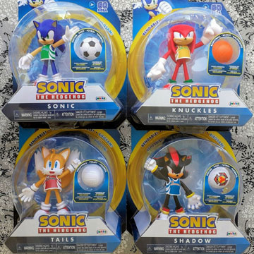 This line features the same figures as released on the first line (minus Eggman) but with a sports theme jersey that's removable & a sport ball instead of the roller wheel character extra.