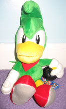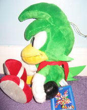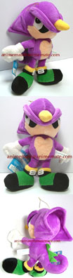 For how popular he is, it's sad to see this is his only plush. However, it's a fairly decent rendition to him, with curling tail and interesting head-fin. They even added the buckles to his shoes. His best view is defenetely the side though, as the black space around his eyes is kind of odd. Still, this guy is a must have for any Espio fan! (remember his costume changed for Sonic Adventure)