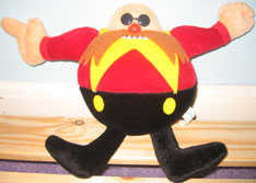 Here's a nice close-up of the Sonic the Fighters Eggman plush. While it seems simplistic, it's actually got some nice detailing. His pants are quite fuzzy, the glasses are a hard plastic, and he even has a plastic nose. If you look closely, you'll see they even bothered to give him teeth. The felt moustache is nice and big too. He has the 'giant finger' thing going on, (Much like some Sonics) but over all this is still a great plush to have for Eggman fans!