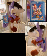 The Espio the Chameleon is also well done and with his turn-around you can see the details of the shoes (with buckles) and that he has the spikes along his back, and curling tail. The face is rather well done and he's accurate seeming from the back as well. These will occaisionally go into and out of stock at www.animemate.com , which sells vintage plushes such as these.