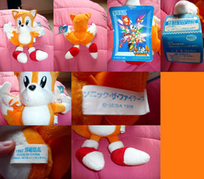 Here's a close up & turn arounds to get a better look at Sonic the Fighters Plush Set Tails. (The group photo for them is on a different page) These were all small, somewhat simple plushes, but the set was remarkable because it had so many rare characters in it. Tails looks good here, with nice big tails, good shoe shape and an ok expression. The things to note here are the tags (front and back, paper & cloth) as there are a LOT of fakes of this set circulating around due to high prices.