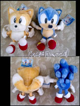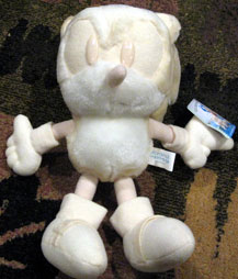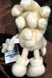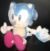 At Rathe's photo you see a good close shot of the pale Sonic. You can see his fuzzy pastel fabric. Up close, he's rather cute, like the pale Tails above. Even his nose, shoes and eyes are a lighter color. This is a very interesting plush.